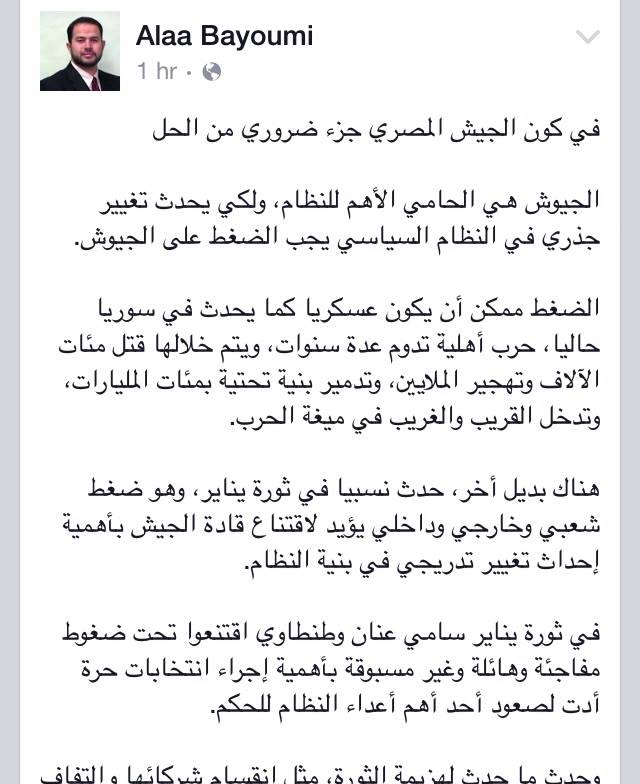 وفي تدوينة نشرها عبر صفحته على موقع “فيس بوك” تحت عنوان “في كون الجيش المصري جزءا ضروريا من الحل”، كتب “بيومي”: “الجيوش هي الحامي الأهم للنظام، ولكي يحدث تغيير جذري في النظام السياسي يجب الضغط على الجيوش، والضغط ممكن أن يكون عسكريا كما يحدث في سوريا حاليا، حرب أهلية تدوم عدة سنوات، ويتم خلالها قتل مئات الآلاف وتهجير الملايين، وتدمير بنية تحتية بمئات المليارات، وتدخل القريب والغريب في ميغة الحرب”.
