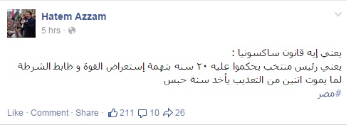 وقال “عزام”، خلال تدوينة له عبر صفحته الرسمية على موقع “فيس بوك”: “يعني إيه قانون ساكسونيا يعني رئيس منتخب يحكموا عليه ٢٠ سنة بتهمة استعراض القوة، وظابط الشرطة لما يموت اتنين من التعذيب ياخد سنة حبسا”.
