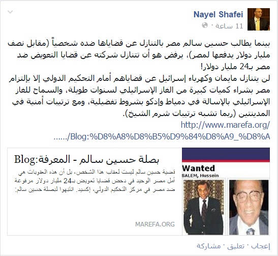 أعرب نائل الشافعي – مدير الموسوعة الإلكترونية “المعرفة” – عن دهشته بأن يطالب حسين سالم مصر بالتنازل عن قضاياها ضده شخصياً، مقابل نصف مليار دولار يدفعها لمصر، بينما يرفض هو أن تتنازل شركته عن قضايا التعويض ضد مصر بـ 24 مليار دولار.
