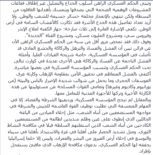 وأكد أنه “بالمقابل لم تنجح المؤسسة العسكرية، ورديفيها الشرطة والقضاء، إلا في المهام المتعسفة التي تطلبت توظيف القوة الغاشمة للجيش والشرطة في مواجهة المستضعفين من أبناء الشعب، مثل إخلاء الميادين من الباعة الجائلين الذي إنطوى على غبن وظلم شديدين لطائفة من المستضعفين الكادحين من أبناء الشعب الذين استغلتهم السلطة قبلا في مكافحة النشاط الثوري. ومثل تشديد الحصار على أهلنا في غزة والاستبداد بأهلنا في سيناء والتوسع في إخلاء أرض الفيروز من البشر والعمران، وليس إلا حلما إسرائيليا يحققه لها الحكم العسكري، بدعوى مكافحة الإرهاب الذي مافتئ يستفحل بإطراد”.