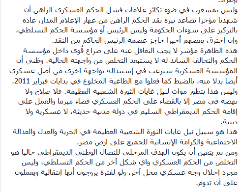 وتابع “وليس هذا بتطور مواتِ لنيل غايات الثورة الشعبية العظيمة. فلا صلاح ولا نهضة في مصر إلا بالقضاء على الحكم العسكري قضاء مبرما، والعمل على إقامة الحكم الديمقراطي السليم في دولة مدنية حديثة، لا عسكرية ولا دينية”.