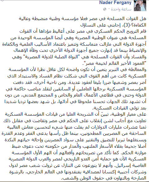 وبين أن الترويج للحكم العسكري في مصر قام على أغاليط مؤداها أن القوات المسلحة هي عنوان الوطنية المصرية، وهي أيضًا المؤسسة الوحيدة من أجهزة الدولة التي مازالت متماسكة، وتتميز باعتماد الأساليب العلمية وبالكفاءة والانضباط، بينما قد انهارت جميع أجهزة الدولة الأخرى تحت وطأة الإهمال والفساد، وأن القوات المسلحة هي “النواة الصلبة للدولة المصرية” وهي “العمود الأخير القائم لخيمة مصر”.