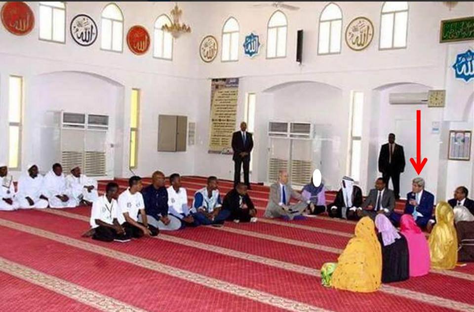 تداول مغردون ونشطاء على موقع التواصل الاجتماعي صورًا لوزير الخارجية الأمريكي، جون كيري، داخل أحد المساجد بجيبوتي، وحوله مجموعة من المسلمين، قالوا إنه يخبرهم كيف يكون الإسلام الوسطي.