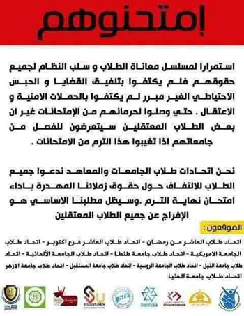 طالبت اتحادات طلاب الجامعات والمعاهد، بالإفراج عن جميع الطلاب المعتقلين، لأداء امتحانات نهاية العام.