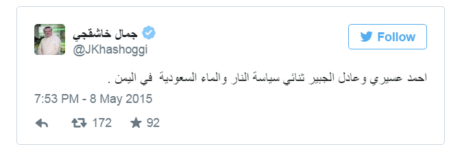 ووصف خاشقجي كلاً من الناطق باسم التحالف العربي العميد أحمد عسيري، ووزير الخارجية السعودي عادل الجبير، بثنائي سياسة النار والماء السعودية في اليمن، في تغريدة أخرى له يوم الجمعة.