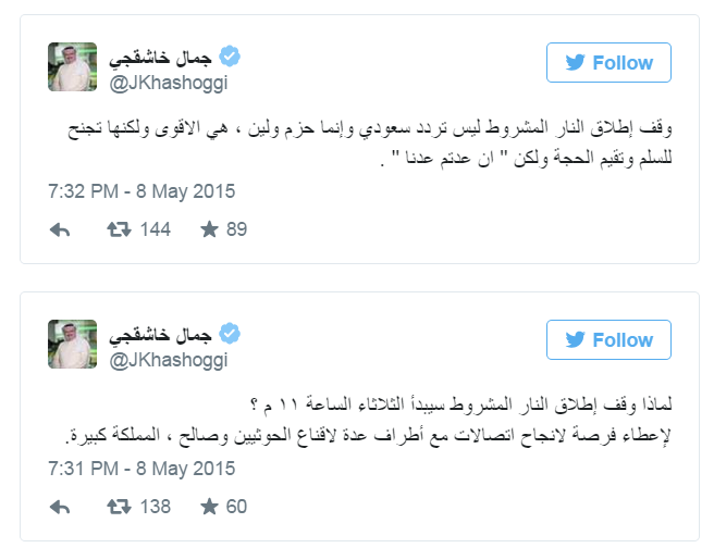 وذكر خاشقجي، في سلسلة تغريدات له في موقع تويتر، إن وقف إطلاق النار المشروط ليس تردداً سعودياً وإنما حزم ولين، وإن السعودية هي الأقوى لكنها “تجنح للين والسلم”.