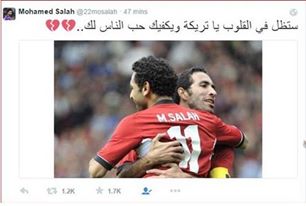 أعلن محمد صلاح، لاعب فريق فيورنتينا الإيطالي، تضامنه مع محمد أبوتريكة، لاعب الأهلي المعتزل، بعد قرار التحفظ على أمواله؛ بسبب انتمائه لجماعة الإخوان المسلمين.