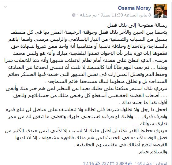 ووجه أسامة مرسي رسالة مفتوحة إلى بلال فضل قال فيها: “يتحفنا بين الحين والآخر بلال فضل وجوقته الرخيصة المغرر بها في كل منعطف، بسيل من السباب والتسفيه من التيار الإسلامي والرئيس مرسي، واصفا إياهم بالسذاجة والانخداع وخلافه”.