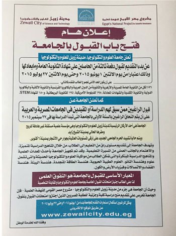 أعلنت مدينة زويل للعلوم والتكنولوجيا، عن فتح باب القبول بالجامعة، وبدء التقديم لقبول دفعة ثالثة من الحاصلين على شهادة الثانوية العامة وما يعادلها، وذلك يوم الإثنين 1 يونيو المقبل، وحتى 27 من الشهر نفسه.