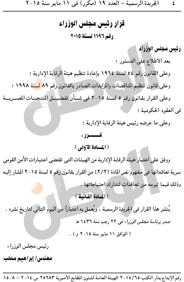 أصدر المهندس إبراهيم محلب، رئيس الحكومة، اليوم الثلاثاء، قرارا بسرية تعاقدات هيئة الرقابة الإدارية