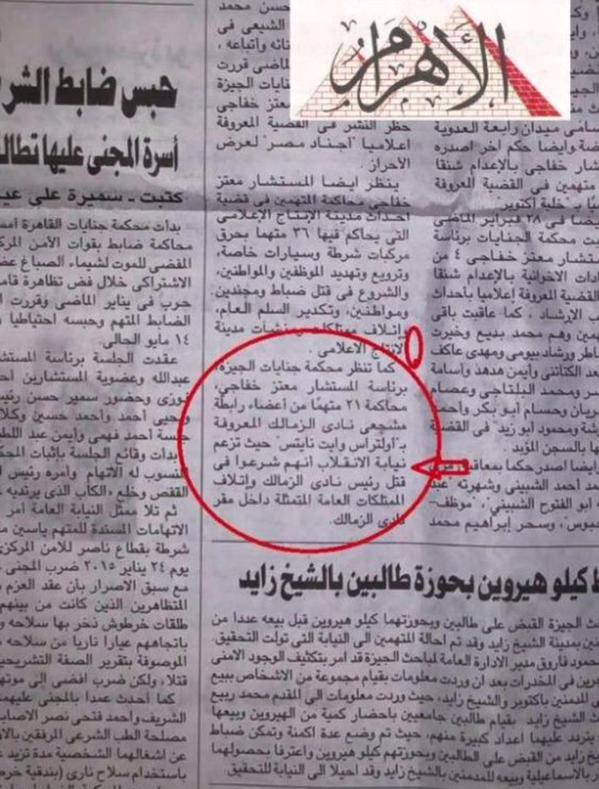 وجاء في نهاية التقرير المطول “كما تنظر محكمة جنايات الجيزة برئاسة المستشار معتز خفاجي محاكمة 21 متهما من أعضاء رابطة مشجعي نادي الزمالك المعروفة بالوايت نايتس، حيث تزعم نيابة الانقلاب……”، والذي مر على الطبعتين الأولى والثانية دون تعديل.