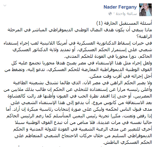 أعرب نادر فرجاني، أستاذ العلوم السياسية بجامعة القاهرة، عن امله في أن يكون الهدف المرحلي للنضال الوطني الديمقراطي حاليا هو التخلص من الحكم العسكري، وليس مجرد إحلال وجه عسكري محل آخر ولو لفترة يروجون أنها إنتقالية ويعملون على أن تدوم.