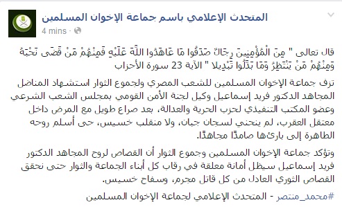 وأضاف: “تزف جماعة الإخوان المسلمين للشعب المصري ولجموع الثوار استشهاد المناضل المجاهد الدكتور فريد إسماعيل، وكيل لجنة الأمن القومي بمجلس الشعب الشرعي وعضو المكتب التنفيذي لحزب الحرية والعدالة، بعد صراع طويل مع المرض داخل معتقل العقرب، لم ينحنِ لسجان جبان، ولا منقلب خسيس، حي أسلم روحه الطاهرة إلى بارئها صامدًا مجاهدًا”.