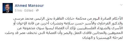 انتقد الإعلامي أحمد منصور، مقدم البرامج الفضائية على قناة “الجزيرة”، الحكم الصادر اليوم بحق الرئيس محمد مرسي وعدد من قيادات جماعة الإخوان المسلمين، بإحالة أوراقهم إلى فضيلة المفتي.