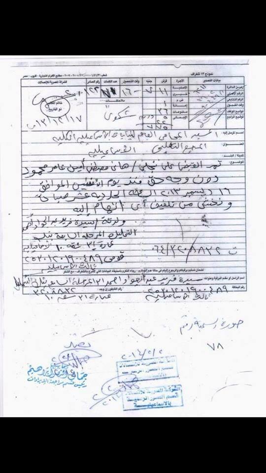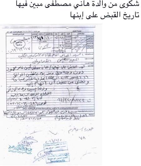 كما تم توثيق اعتقال المتهم الثالث هاني مصطفى أمين عامر بتاريخ 16/12/2013 حيث تم إلقاء القبض عليه مع صهره أحمد سليمان من مكتب رئيس حي ثالث بالإسماعيلية وتم اقتيادهم إلى سجن معسكر الجلاء بالجيش الثاني الميداني والشهير بالعزولي ليواجه كل منهما تهما مختلفة لوقائع حدثت بعد اعتقالهما وأجبرا على التوقيع على تلك التهم تحت وطأة التعذيب وتم تقديم أوراق رسمية تثبت ذلك ومحاضر تحقيقات النيابة العامة التي تفيد اعتقاله قبل تلك الوقائع إلا أن المحكمة لم تنظر إليها أو تعرها اهتماما.