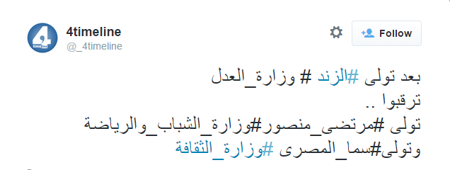 وعلق 4timeline، “بعد تولى #الزند # وزارة_العدل ترقبوا ..تولى #مرتضى_منصور#وزارة_الشباب_والرياضة وتولى#سما_المصرى #وزارة_الثقافة”.