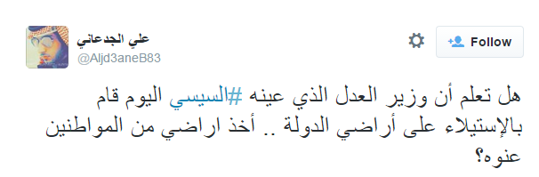وقال علي الجدعاني “هل تعلم أن وزير العدل الذي عينه #السيسي اليوم قام بالإستيلاء على أراضي الدولة .. أخذ اراضي من المواطنين عنوه؟”.