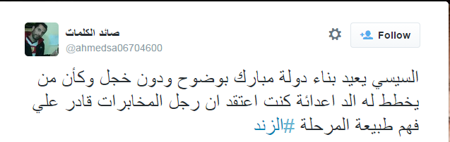 وقال صائد الكلمات “السيسي يعيد بناء دولة مبارك بوضوح ودون خجل وكأن من يخطط له الد اعدائة كنت اعتقد ان رجل المخابرات قادر علي فهم طبيعة المرحلة”.