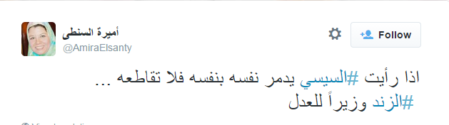 وأضاف أميرة السنطى “إذا رأيت #السيسي يدمر نفسه بنفسه فلا تقاطعه #الزند وزيراً للعدل”.