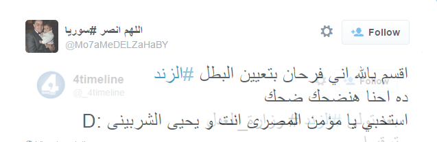 Mo7aMeDELZaHaBY وأعرب الناشط “ساخرا” عن فرحته بتعيين الزند، قائلا :”اقسم بالله اني فرحان بتعيين البطل الزند.. ده احنا هنضحك ضحك استخبي يا مؤمن “.