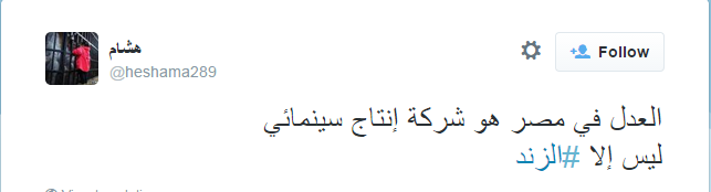 فيما أضاف هشام “العدل في مصر هو شركة إنتاج سينمائي ليس إﻻ #الزند”.