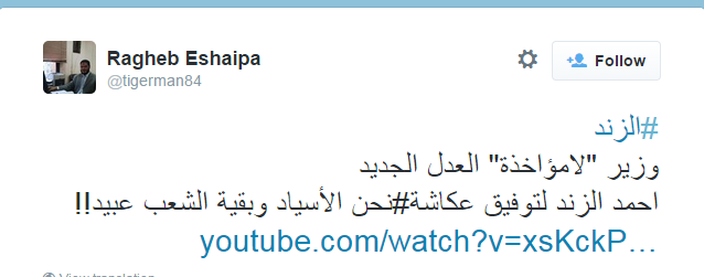 فضلا عن رابط آخر لحوار بين الزند مع توفيق عكاشه، أكد خلاله أن الشعب هم العبيد، بينما القضاه أسيادهم، إذ وضعت Ragheb Eshaipa الرابط على صفحتها، معلقة “الزند وزير “لامؤاخذة” العدل الجديد، أحمد الزند لتوفيق عكاشة#نحن الأسياد وبقية الشعب عبيد!!