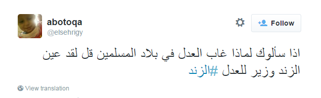 فيما قال abotoqa “إذا سألوك لماذا غاب العدل في بلاد المسلمين قل لقد عين الزند وزير للعدل #الزند”.