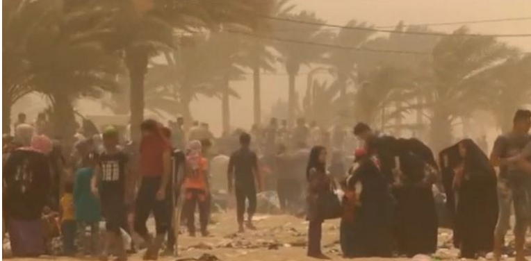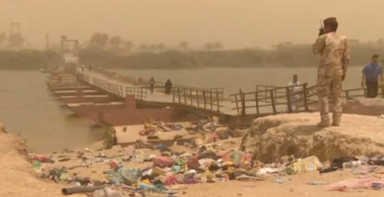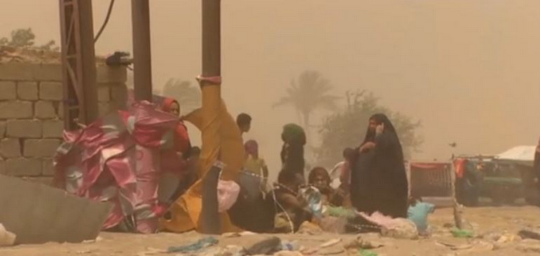وسط العواصف الرملية، علقت عائلات عراقية نازحة من رحى المعارك التي تجتاح محافظة الأنبار باتجاه بغداد، ليعترضها الجسر الموصل إلى طريق بغداد، والذي قامت السلطات العراقية بإغلاق حركة المرور من خلاله.