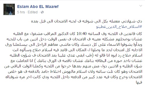 وكتب، في منشور له عبر صفحته على موقع “فيس بوك”: “دي شهادتي مفصلة بكل اللي شوفته في لجنة الامتحان اللي قتل بعدها #إسلام_صلاح_الدين_عطيتو، كنا قاعدين في اللجنة وفي الساعة 10:40 كان الدكتور المراقب مشغول مع الطلبة علشان يوضح لهم مشكلة معينة في الامتحان، في نفس الوقت دخل اثنين من باب اللجنة وبدؤوا يشوفوا الأسماء على كل ديسك، وكان ماشي معاهم الراجل اللي بيسلم لنا ورق الإجابة لكل امتحان”.