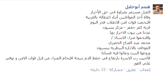 وأضاف “واقتحموا منزل محمد عبد الفتاح الحضري، وروعوا البيت وعاثوا فيه فسادًا، فأصيب رب الأسرة بارتفاع في ضغط الدم نتيجة اقتحام المنزل من قبل قوات الأمن وتوفي على الفور”.