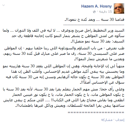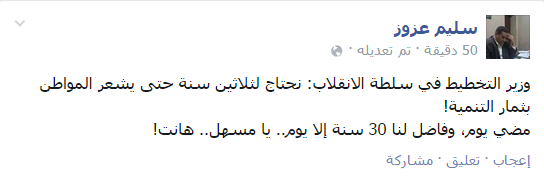 وقال الكاتب الصحفي، سليم عزوز: “وزير التخطيط في سلطة الانقلاب: نحتاج لثلاثين سنة حتى يشعر المواطن بثمار التنمية!“.