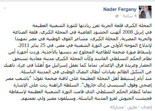 وتابع “وردّت أجهزة أمن نظام الحكم التسلطي الفاسد، وكأن المحلة الكبرى مدينة معادية تستحق الحصار وعربدة فرق الإعدام، تماما كما تفعل إسرائيل مع أهلنا في غزة، ناهيك عن التنكيل الظالم بقيادات أبطال النضال الوطني في المدينة الباسلة”.