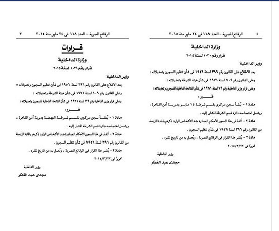 وأشار فيهما الي موافقتة بإنشاء سجن مركزي بداخل مبنى قسمي الشرطة وتنفذ في هذا السجن الأحكام الصادرة ضد الاشخاص الوارد ذكرهم في المادة الرابعة من القانون رقم 196 لسنة 1956في شأن تنظيم السجون .