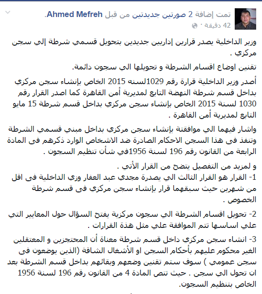 أوضح الناشط الحقوقي، أحمد مفرح، مدير مؤسسة الكرامة لحقوق الإنسان، عدة تفاصيل ملابسات حول إصدار وزير الداخلية لقرارين إداريين جديدين بتحويل قسمي شرطة إلى سجن مركزي، وتقنين أوضاع أقسام الشرطة وتحويلها إلى سجون دائمة.