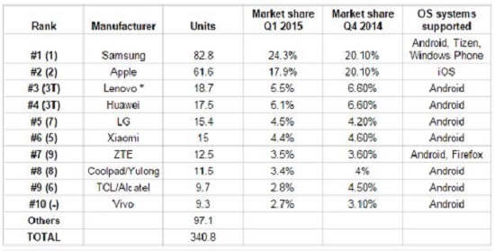 وذلك وفقًا لما نشره موقع gsmarena الهندى، فإن الشركة الكورية الجنوبية، والتى قامت بالفعل بشحن ما مجموعه 82.8 مليون وحدة فى هذا الربع لانتزاع حصة سوقية بنسبة 24.3%، ثم تلتها شركة أبل بمقدار ما يصل إلى 18% من حصة السوق، أما لينوفو وهواوى وLG فيأتون بنسب 5.5 و5.1 و4.5% على التوالى.