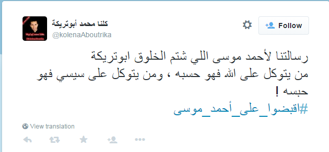 وقالت صفحة “كلنا محمد أبو تركية”، “رسالتنا لأحمد موسى اللي شتم الخلوق أبوتريكة ..من يتوكل على الله فهو حسبه ، ومن يتوكل على سيسي فهو حبسه ! “.