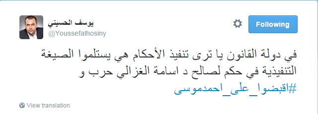 دشن ناشطون على مواقع التواصل الاجتماعي فيس بوك وتويتر، حملة للمطالبة بالقبض على الإعلامي، أحمد موسى، بعد صدور حكم بتأييد حبسه لمده عامين، بعد إدانته بتهمة “سب وقذف” أسامه الغزالي حرب.