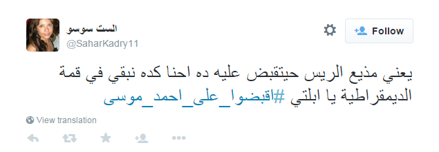 وعلقت SaharKadry11 “يعني مذيع الريس حيتقبض عليه ده احنا كده نبقي في قمة الديمقراطية يا ابلتي”.