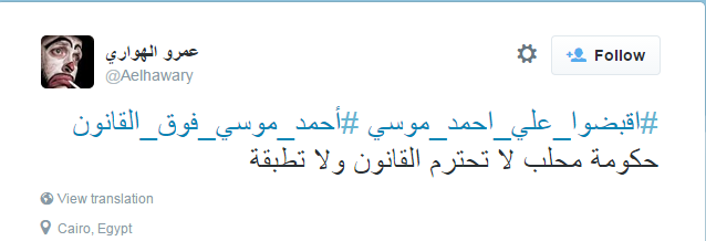 وعلق عمرو الهواري بقوله ” #أحمد_موسي_فوق_القانون.. حكومة محلب لا تحترم القانون ولا تطبق“.