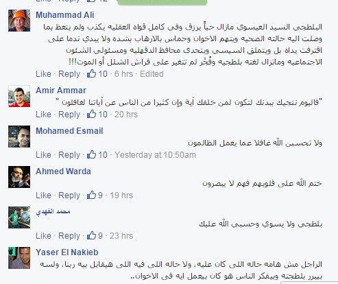 ويشكو العيسوى في الفيديو المصور له إهمال المسؤولين في علاجه، موجهًا رسالة إلى عبد الفتاح السيسي قائد الانقلاب، قائلا: “أنا أصبت بـ13 طلقة في جسمي، وللأسف في عهدك.. للأسف الحكومة وصلتني للدرجة اللي هتشوفها دلوقتي، وصلت وكأني في مجاعة بسبب الضمور العضلي، والرصاص ما زال موجودا في جسمي، محافظ المنصورة وعدني هيبعت لجنة طبية للبيت لتوقيع الكشف عليّ ومابعتش، قالوا هيعملوا ليّ معاش 320 جنيه ورفضت، لأن ده مش قيمتي”.