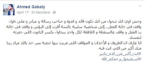 ومن بين كتاباته: “وحش أوي أنك تتحول من أنك تكون قائد وقدوة وصاحب رسالة ومبادر وعلى طول واقف في خانة الفعل.. إلى شخصية سلبية يائسة أقرب إلى البؤس وواقف في خانة رد الفعل وواقف عالسقطة واللاقطة لكل واحد بيحاول يكسر التابوت اللي حفرته لنفسك”.