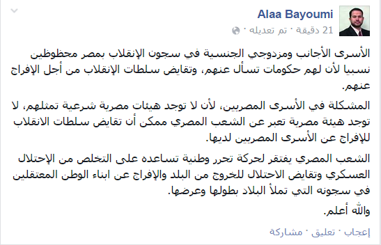 جاء ذلك عبر تدوينة له على موقع التواصل الاجتماعي “فيس بوك”- تعليقا على خبر الإفراج عن محمد سلطان، نجل الداعية عصام سلطان، بعد التنازل عن جنسيته المصرية.