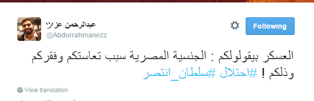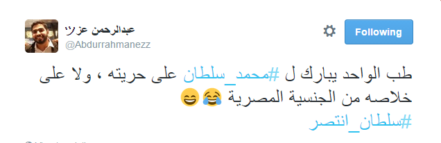 وأعرب الناشط السياسي عبد الرحمن عز، عن حيرته قائلا “طب الواحد يبارك لمحمد سلطان على حريته، ولا على خلاصه من الجنسية المصرية”، وأضاف “العسكر بيقولولكم : الجنسية المصرية سبب تعاستكم وفقركم وذلكم”.