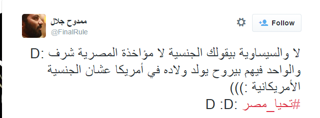 وعلق ممدوح جلال ساخرا “لا والسيساوية بيقولك الجنسية لا مؤاخذة المصرية شرف 😀 والواحد فيهم بيروح يولد ولاده في أمريكا عشان الجنسية الأمريكانية “.