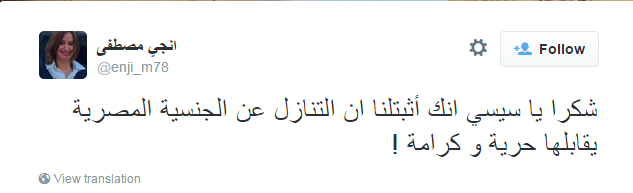 وقالت أنجي مصطفى “شكرا يا سيسي انك أثبتلنا ان التنازل عن الجنسية المصرية يقابلها حرية و كرامة !“.