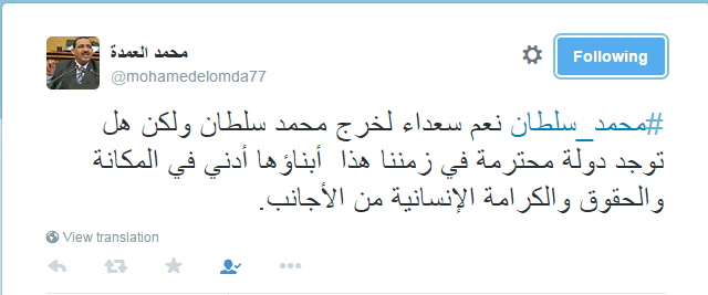 وأعرب محمد العمدة، عن سعادته بخروج محمد سلطان، مستدركا “ولكن هل توجد دولة محترمة في زمننا هذا .. أبناؤها أدنى في المكانة والحقوق والكرامة الإنسانية من الأجانب”.