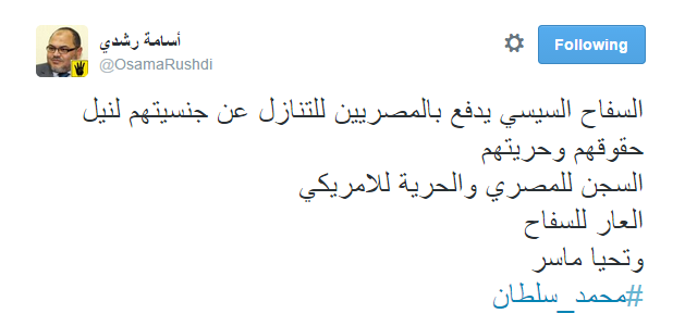 وعلق أسامة رشدي، قائلا “السفاح السيسي يدفع بالمصريين للتنازل عن جنسيتهم لنيل حقوقهم وحريتهم.. السجن للمصري والحرية للامريكي.. العار للسفاح”.