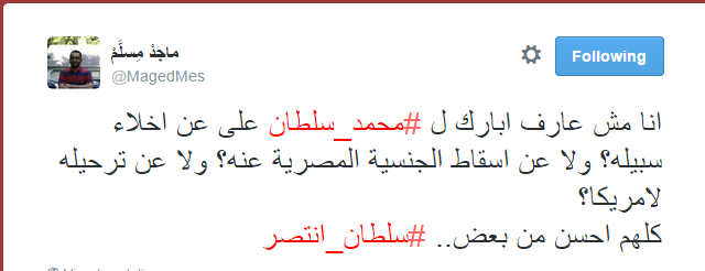 يقول ماجدْ مِسلَّمْ “أنا مش عارف ابارك لمحمدسلطان على عن اخلاء سبيله؟ ولا عن اسقاط الجنسية المصرية عنه؟ ولا عن ترحيله لامريكا؟كلهم احسن من بعض”.
