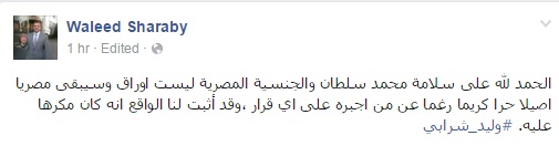 وكتب في منشور له عبر صفحته على موقع “فيس بوك”: “الحمد لله على سلامة “سلطان” والجنسية المصرية ليست أوراق وسيبقى مصريا أصيلا حرا كريما، رغما عن من أجبره على أي قرار، وقد أثبت لنا الواقع أنه كان مكرها عليه.