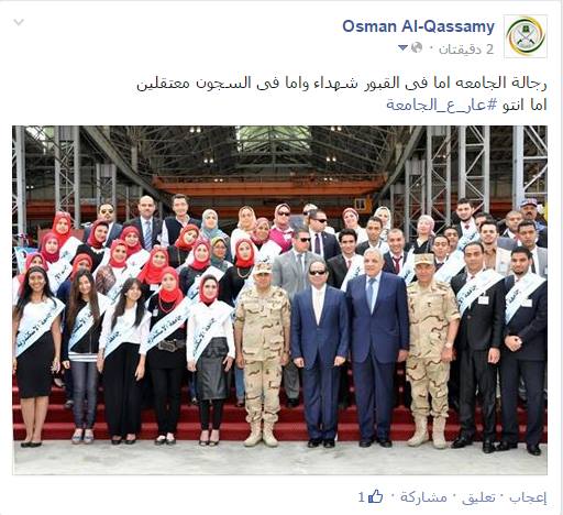 اشتعلت اليوم نيران هائلة وسط جموع طلاب جامعة الاسكندرية بعد أن نشرت جريدة اليوم السابع صورة لعدد من طلاب الجامعة كان معظمهم من حركة “صوت الميدان” في لقاء جمعهم اليوم بقائد الانقلاب العسكري، عبدالفتاح السيسي، في الترسانة بغرب الإسكندرية أثناء وجوده بها اليوم، حيث اتهم الطلاب “صوت الميدان” بالخيانة.